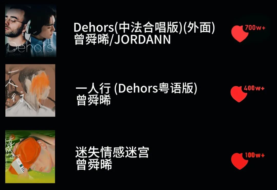 持续发歌的他目前已经集齐了中法合唱《Dehors》《一人行(粤语版)》《迷失情感迷宫》三首百万收藏单曲,在音乐这块完全有拿得出手的代表作品。