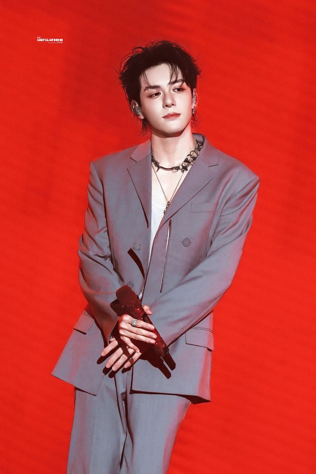 次日的中世纪贵族风格造型则在诠释另一种魅力,黑色镶金边宫廷感西装内搭翻领衬衫,还真有古堡王子内味儿了。