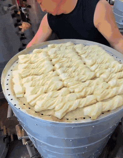 除了物价便宜,东北早市的小吃还是典型的“走量款”。特别是那些让人迈不开腿的“碳水炸弹”,一元一个的油炸糕、馅饼,用料实实在在。两块钱的豆浆、豆腐脑,直接用大桶盛着,管饱管够。现场制作的“碴子条”(玉米面面条)在热气蒸腾中出锅,浇上一勺卤子就是顿扎实的早饭。
